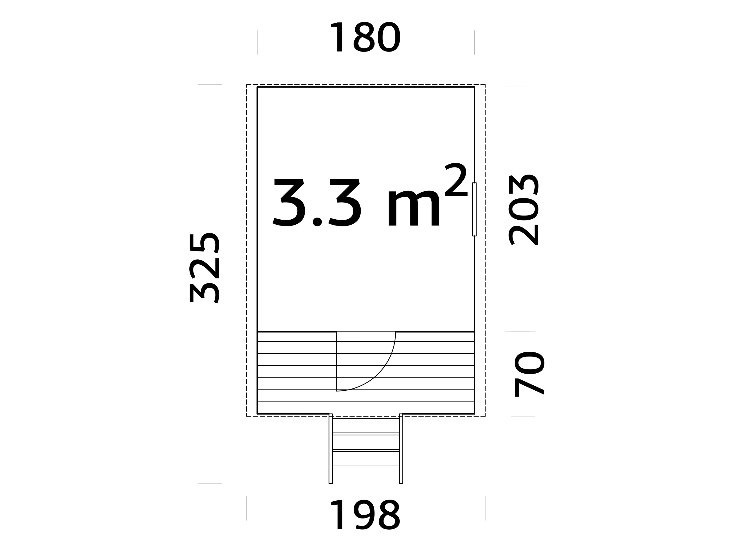 - Maße über alles (inkl. Terrasse und Treppe): ca. 180 x 331 cm (Breite x Tiefe)