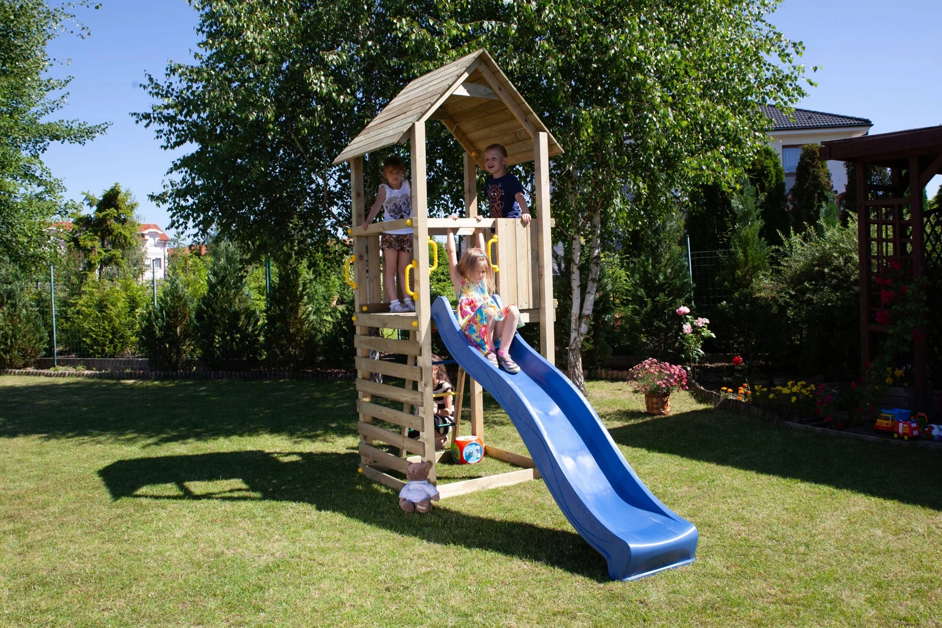 Das Kinderstelzenhaus CAROL 1 lässt sich perfekt in jeden Garten integrieren und bietet Kindern einen eigenen Spielbereich für Bewegung, Abenteuer und fantasievolles Spielen im Freien. Das durchdachte Design ermöglicht sowohl gemeinsames Spielen mit Freunden als auch eigenständige Aktivitäten.