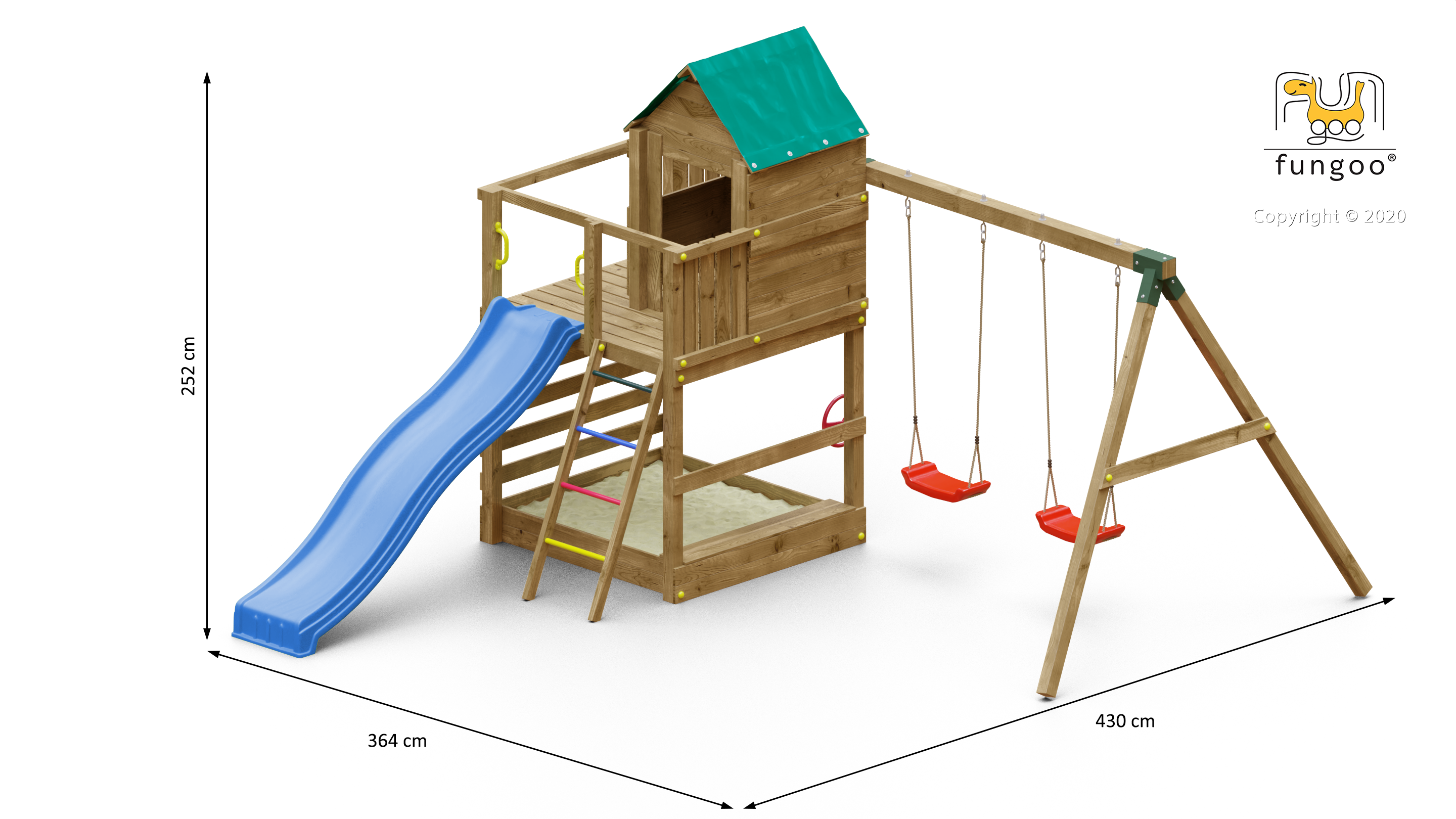 - Außenmaße: ca. 430 × 364 × 252 cm (Breite × Tiefe × Höhe)