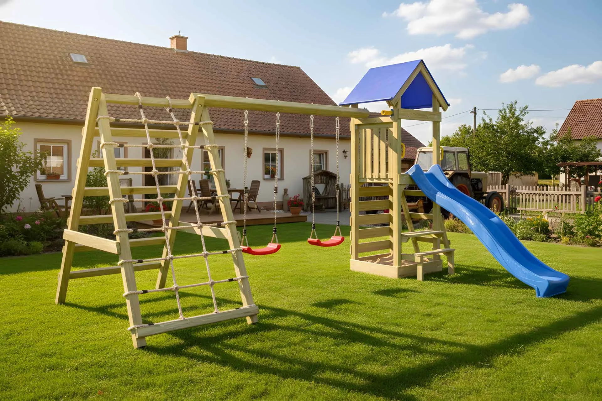 - inklusive Doppelschaukel-Anbau mit zwei roten Schaukelbrettern